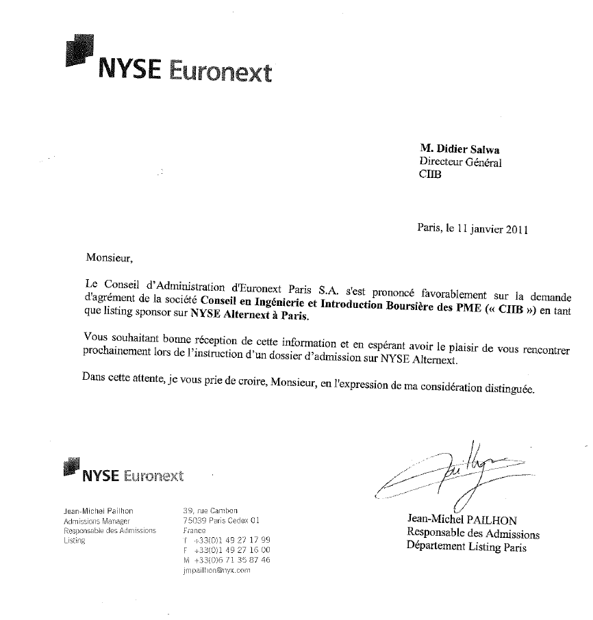 2011 – CIIB obtient l’agrément Listing Sponsor sur Alternext (désormais Euronext Growth) (agrément). Préparation des entreprises à l’introduction sur Euronext Access et Growth.