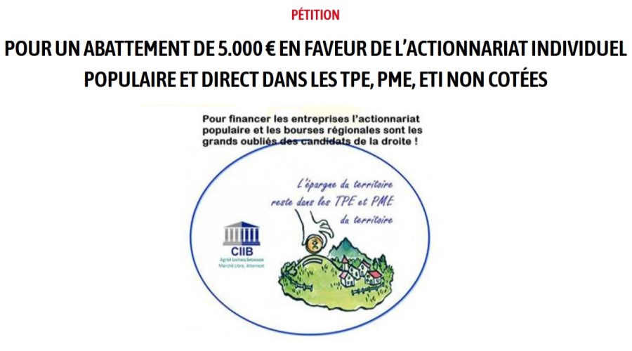 Capitalisme populaire et actionnariat individuel : encourageons fiscalement l’investissement direct dans les TPE, PME et ETI non cotées. Une pétition propose la mise en place d’un abattement de 5 000 € en faveur de l’actionnariat individuel popula...