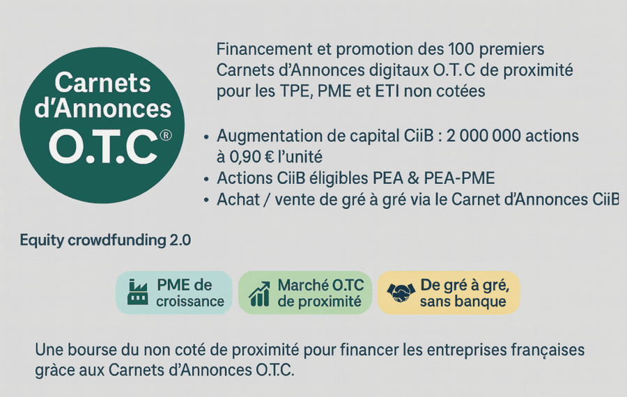Pour financer le développement et la promotion, sans la bourse, des 100 premiers Carnets d'Annonces digitaux O.T.C de proximité, CiiB augmente son capital par cession de gré à gré de 2 000 000 actions au prix unitaire de 0,90 €.